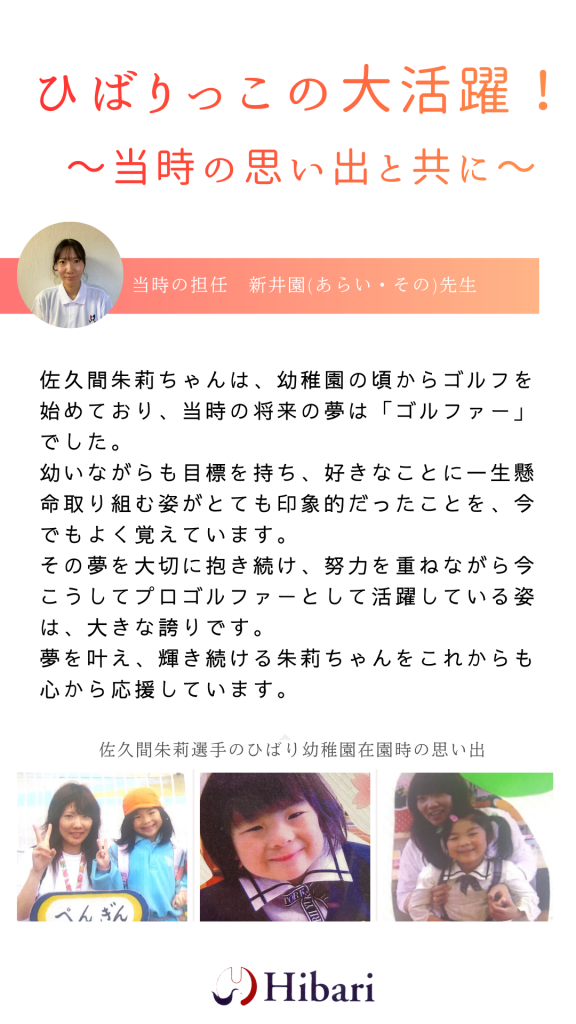 ひばり幼稚園の卒園児佐久間朱莉(さくま・しゅり)選手が、2025年度 日本女子プロゴルフ協会(JLPGA)ツアー メルセデス・ランキング年間1位となり、 見事、年間女王の栄冠に輝きました!